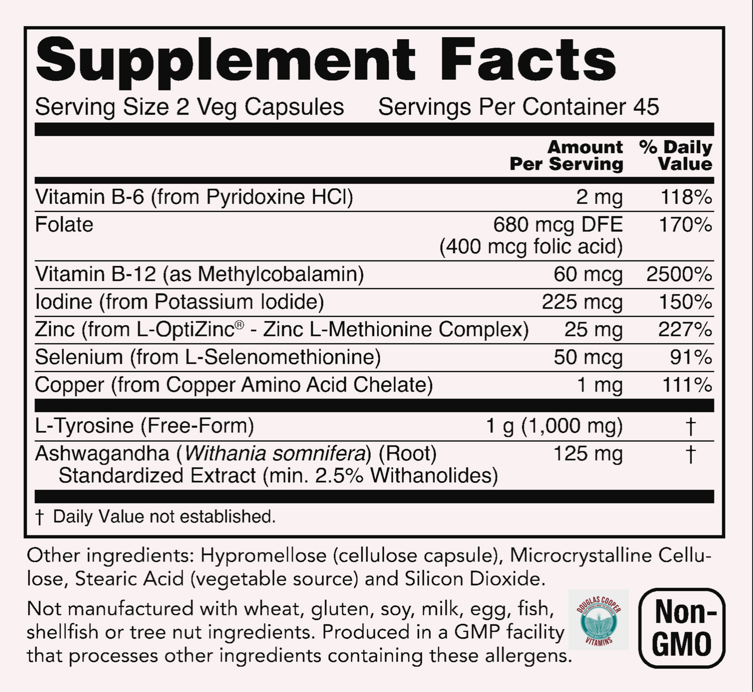 Healthy THYROID function. Contains: L-Tyrosine, Iodine and Guggul: responsible for producing and maintaining thyroid hormone. Selenium: antioxidant. Irish Moss: nutrition. Plus: Vitamins B-6, B-12, Folate, Potassium Iodine, Selenium, Zinc, Copper, and Ashwagandha.